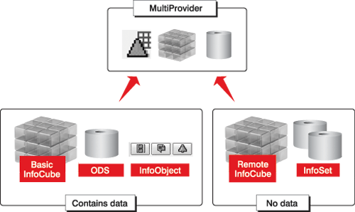 5. Leverage virtual InfoProviders — MultiCubes/MultiProviders. InfoProviders are physical or virtual data objects that provide information for reporting purposes. In BW 2.x and earlier, the only InfoProviders available as data targets are InfoCubes, ODSs, and master data objects. Starting with BW 3.x, additional InfoProvider options such as InfoSets and MultiCubes/ MultiProviders are available.