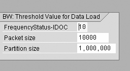 10. Leverage PSA partitioning. This improves data-load performance. With a partitioned PSA, it is possible to insert arrays (multiple records at a time). These insertions occur into smaller database objects and therefore result in faster data loads. The partitions are created based on the threshold value for the data load defined via transaction RSCUST6. The partition size is set by the BW administrator on a trial-and-error basis. The default value is one million (SAP note 325839). This threshold setting (below) defines the partition size and determines if a new partition is required when a new data load is added.