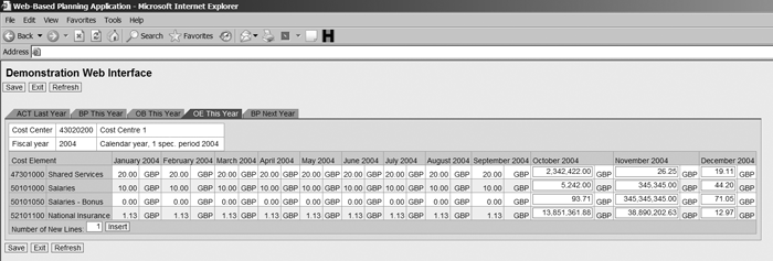 BPS manual planning supports a number of mechanisms for uploading data such as SAPGUI, Excel, and the Web. The Excel option is more popular with users because you can cut and paste, whereas the Web-based front end is more suited to lower volumes of data. See Figure 6 for an example of the Web-based BPS front end.