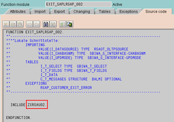 Double-click include ZXRSAU02 (Figure 2). Click the Change button to access the edit mode. This is where you implement the generic code that the system calls each time you execute a DataSource.