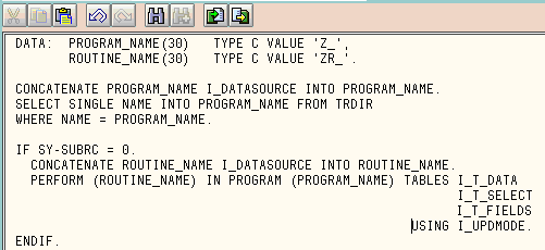 The logic that the generic code performs is simple: When the code calls the DataSource from SAP NetWeaver BI, it builds a program name with the DataSource technical name preceded by a Z_. For example, for the 0MATERIAL_ATTR DataSource, the code builds the program name Z_0MATERIAL_ATTR. Then, the system searches the program name table (TRDIR) to check if the program exists. If this is the case, the system calls a subroutine within the program Z_0MATERIAL_ATTR. The relevant information (data, selection, field name, update mode) is passed to the program, which can now perform the logic specific to the DataSource.