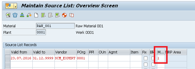 In addition, the source list is only considered within this validity period. Therefore, if there is a requirement before the source list validity, MRP does not consider it when generating a new replenishment proposal to cover this requirement.