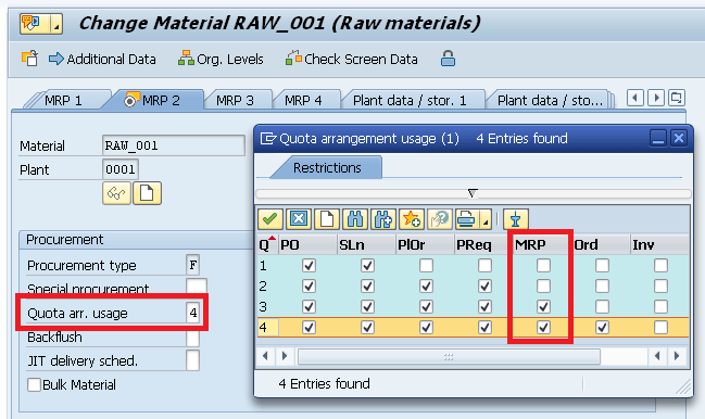 The prerequisite to have the quota arrangement during the MRP run is that the field Quota arrangement usage must be set to a value that allows the usage in MRP, such as the quota arrangement 4, highlighted in Figure 4. The Quota arr. Usage (quota arrangement usage) field can be found in the Purchasing and MRP 2 tabs of the material master.
