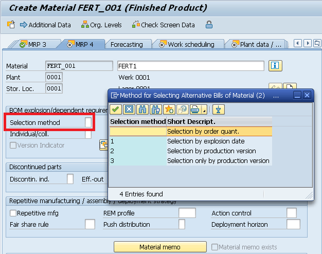 In SAP ERP, the BOM selection can be controlled by the field BOM Selection Method, which is available on the Material Master tab MRP 4. This field offers four different options for the BOM selection for planned orders (Figure 9):