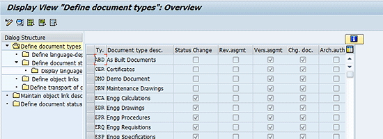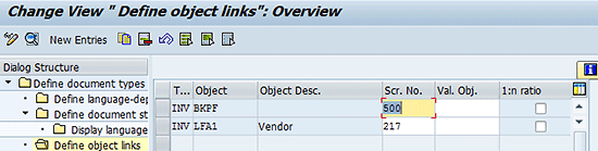 To define document types use transaction SPRO and follow menu path SAP Customizing Implementation Guide > Cross-Application Components > Document Management > Control Data > Define Document Types. That takes you to Figure 14. The user searches for document type INV, selects the INV line, and double-clicks Define object links in the left navigation pane.