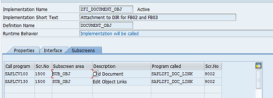 This BAdI DOCUMENT_OBJ has a subscreen exit that you need to implement to display the Object Links tab in the DIR. Screen 9002 (Figure 21) is created in program SAPLZFI_DOC_LINK for three fields: Document Number, Fiscal Year, and Company Code.