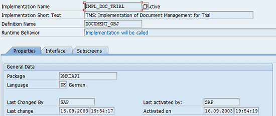 This BAdI has several methods you need to implement. To see the default implementation IMPL_DOC_TRIAL of BAdI DOCUMENT_OBJ, execute transaction code SE18. Enter the BAdI name DOCUMENT_OBJ and select Enhancement Implementation > Overview (