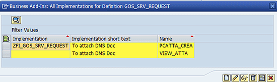 Figure 6. As required, I added two filters to create and view an attachment. Press F4 to choose the filter value. You implement BAdI START_SERVICE by clicking the save icon and then the activate icon.