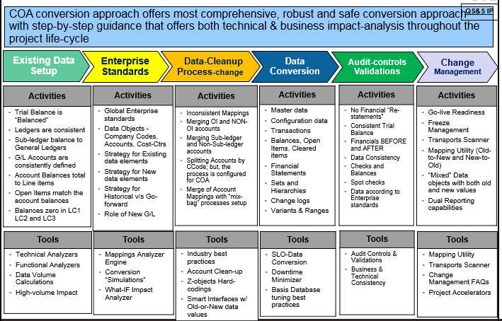 The COA conversion involves database-level changes and needs extensive system resources to manage the conversion. However, technical data conversion is just a fractional part of the overall project. The overall COA conversion project has a significant business impact with changes to global design, data cleanup, and change processes to adapt to standardized business processes, core integration, change management, and more.