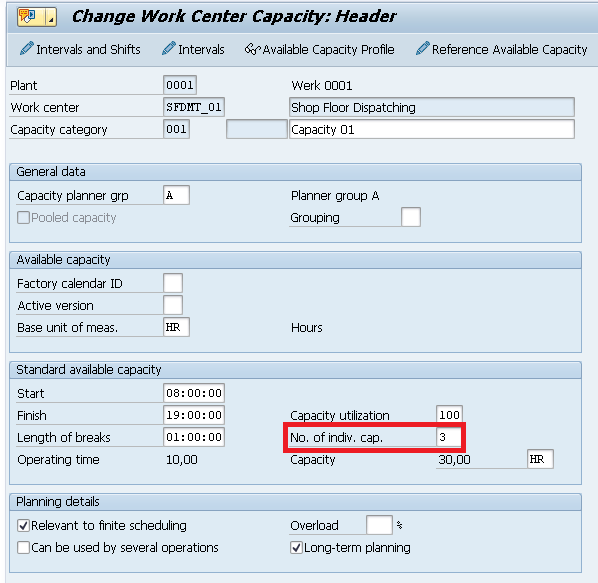 The first step is to generate the individual capacities for the work centers you want to monitor. In the work center capacity header you define the number of individual capacities to be generated. In my example, you are going to use work center SFDMT_01 with three individual capacities.