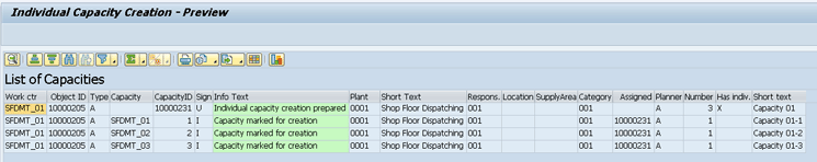 Figure 5 you can see the output of this transaction. Note that individual capacities were created for your work center SFDMT_01, which corresponds to the number of individual capacities defined for the work center, as shown in