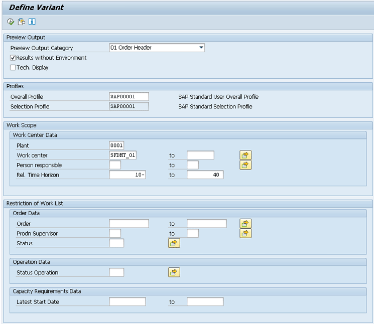Figure 6, you need to input data for the Overall Profile, which contains the basic settings for the display of selection parameters for the SFDM Tool. In my example, you use the standard profile SAP00001, which SAP delivers, so you enter SAP00001 in the Overall Profile field. In the Preview Output Category field, you can select on which level the result is later displayed. The default option is to display the results at the order header level, but you can also display, for example, at the operation or work center level. By selecting the check box Results without Environment, you instruct the system to select only capacity requirements directly related to the selection criteria. When this check box is selected, the results include additional order-related data that is not actively planned within the SFDM Tool, but that is relevant for alerts and for all the information in the order view.