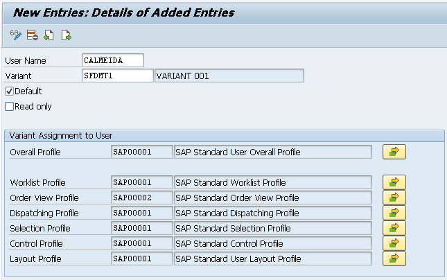 The last step in the ERP side is to assign the variant created to the user. To complete this step, execute transaction code SFDV. This way, each user can have his or her own variant and work with a different sub-set of orders and capacity requirements. When you call this transaction, the system displays a list of all the users and the assigned variants, as shown in