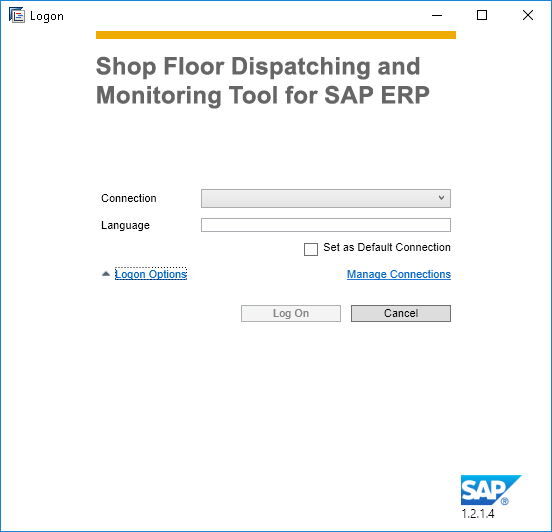 When the front end is installed on a computer, it brings an executable file, which should be run to launch the tool. When you access the SDFM Tool for the first time, you need to create a connection with the ERP system where the add-on was installed. You can do that by selecting the Manage Connections option, which is located in the Logon screen under the Logon Options.
