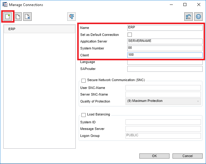 In the Manage Connections screen, click the create icon (highlighted in