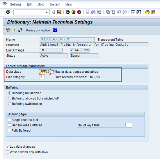 Click the Technical Settings button as shown in Figure 4. In the next screen (Figure 5), enter the technical details in the fields under the Logical storage parameters section (e.g., Data class and Size category). You can also select the Log data changes check box if you want to record any addition, change, or deletion by various users in this table.