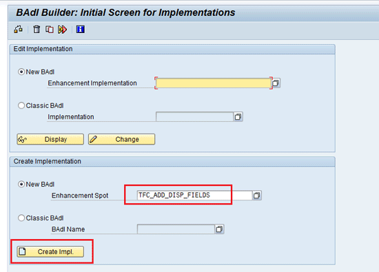 After you have made the custom-developed table and have enhanced the standard include, you need to implement a BAdI to build the logic for filling these new fields. To complete this step, execute transaction code SE19 or follow menu path Tools > ABAP Workbench > Utilities > Business Add-Ins > SE19 - Implementation. This action opens the screen as shown in Figure 16. Enter the BAdI name as TFC_ADD_DISP_FIELDS and click the Create Impl. (Create implementation) button.