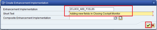 In the next screen (Figure 17) enter a name in the Enhancement Implementation field (e.g., ZCLOCO_ADD_FIELDS) for the custom implementation name and a short description in the Short Text field. After you enter data in these fields, click the enter icon (the green check mark).