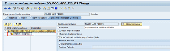 In the next screen, expand the left side of the menu and double-click Implementing Class as shown in Figure 19. The implementation class derives the method characteristics (Parameters, exceptions etc.) from the SAP standard BAdI.