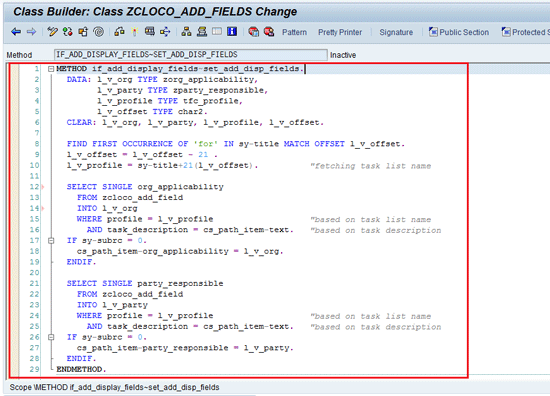 Now you paste the code logic for selecting the organization applicability and party responsible from the custom-developed table ZCLOCO_ADD_FIELD in the Class Builder screen. Figure 22 shows this code logic.