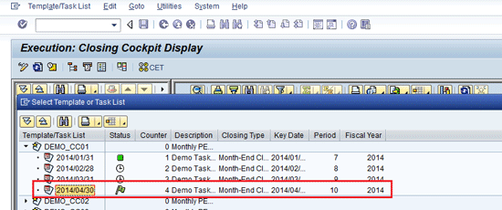 By default, the new fields added do not appear in the SAP Financial Closing Cockpit monitor. To change the layout to include these new fields in the SAP Closing Cockpit monitor display, execute transaction code CLOCO. In the screen that appears, double-click your task list as shown in Figure 28 (In the same way, you can also select the template after executing transaction code CLOCO).
