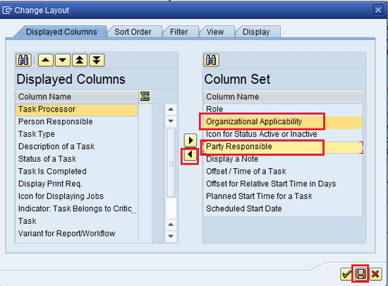 In the new screen that appears (Figure 30), select the new fields (e.g., Organizational Applicability and Party Responsible) and click the icon shown in the middle of Figure 30 to move them to the Displayed Columns section. Click the save icon.