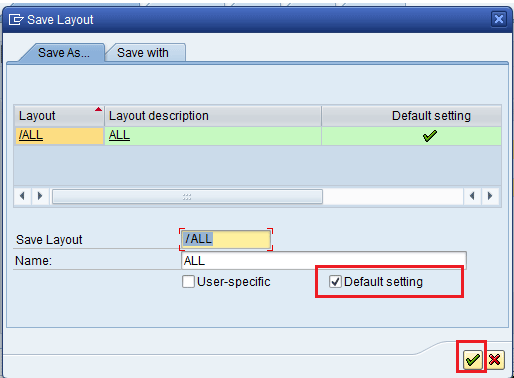 In the next screen (Figure 31) click the Default setting box to save the layout as default settings. Now click the green check mark icon.