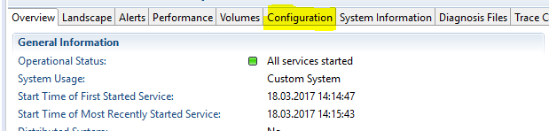 The settings can be changed by the help of SAP HANA studio, Eclipse Studio, or directly inside SAP GUI transactions. Within SAP HANA or Eclipse Studio, double-click your selected system (e.g., production) and navigate to the Configuration tab (Figure 1).