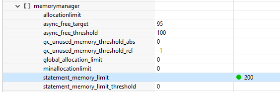 As you can see the parameter statement_memory_limit has no value specified. To change the parameter, proceed as described before by double-clicking the value and changing the value (e.g., to 200 GB).