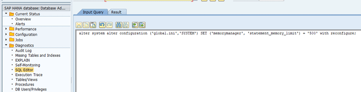 alter system alter configuration ('global.ini','SYSTEM') SET ('memorymanager', 'statement_memory_limit') = '500' with reconfigure;