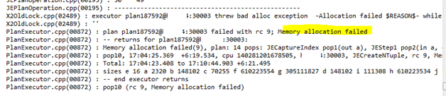 In a test case I set up in our test environment, I forced a process (query) to consume more than the allowed 500 GB of working memory, which was the cause for creating an error entry for the trace user. An error message is given to the user. In this case when executing the safety belt, you see a trace file entry such as SAPDBTech JDBC: [2048]: column store error: searchtable error: [9] Memory allocation failed.