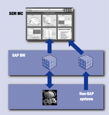 Figure 2.) It displays data graphically on a computer screen, giving the computer’s user an alternative to viewing the data in the standard tabular format found in BW. The cockpit has the same types of graphs that you find in Microsoft Excel such as line graphs, column graphs, and tachometers. As with all of SEM’s components, the cockpit is installed on SAP’s BW. This means that BW acts as the cockpit’s database, with the cockpit displaying data stored in BW. (See