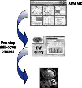 It takes some planning to determine the optimal BW queries and R/3 reports to link to certain MC graphs. For example, a summarized MC sales graph should have a more detailed (but not line item granularity) BW query assigned to it. This way a user can, for example, look at a corporate-wide sales revenue graph and drill into a BW query that lists sales revenues by region and by product. A deeper drill-down into R/3 would take the user into specific sales line items that cannot be seen in BW/SEM.