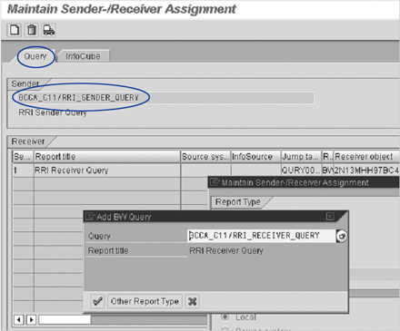 - In the top half of the Maintain Sender-/Receiver Assignment pop-up window, select ABAP report. In the bottom half, select Source system. In the empty field to the right, choose the R/3 system where your R/3 line item detail report resides.
