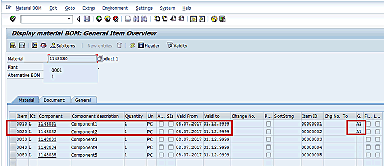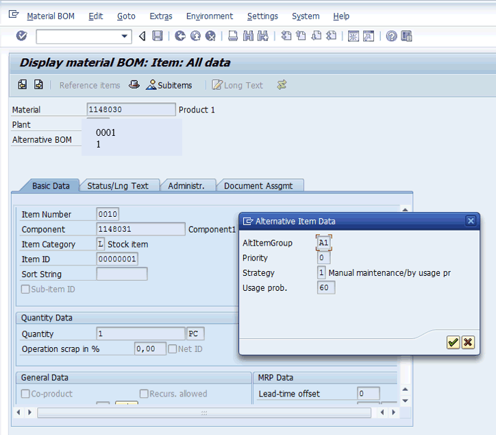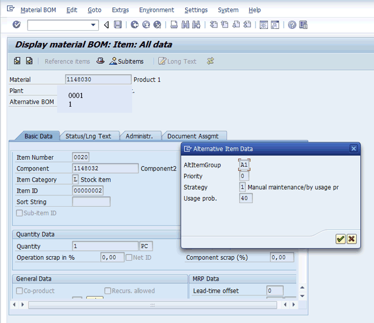 In Figure 1 the fields that you need to populate are Plant and Material. In my example, enter 0001 for the plant and 1148030 for the material. Now you are ready to split the production order component quantity between two alternate BOM components with usage probabilities. Consider the example BOM displayed in Figure 2.