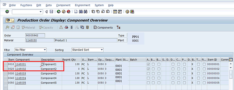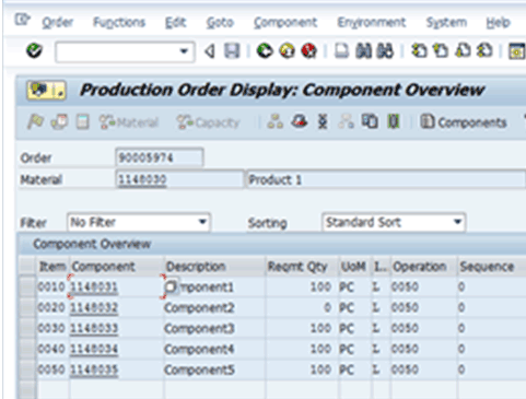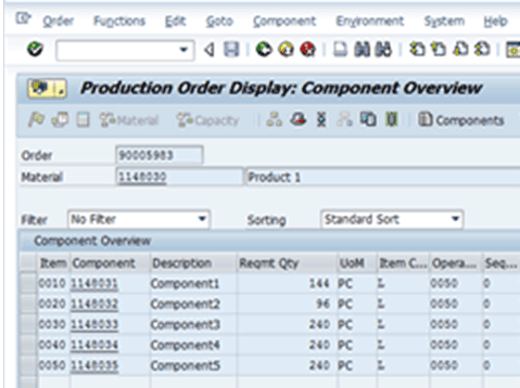 Display another production order using transaction code CO03 and navigate to the Component Overview screen. In example 2, the number of planned orders converted is less than or equal to the number of BOM alternate items. In this example, each converted production order needs to have quantities of alternate items split proportionately to use probabilities as shown in Figure 6.