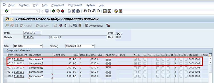 Display the production order using transaction CO03 and navigate to the Component Overview screen. In this example, one of the components is to be allocated at the full required quantity (100 percent allocation) and the others at 0 percent.