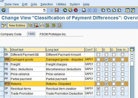 In this example, FSCM Prototype, Inc. created nine reason codes to trace the source of payment differences. You can see four indicators against each reason code configured in the system. To use the reason code in dispute management, select the second indicator (D) in the screen. In this example, DDG and RTD are set up for dispute management.