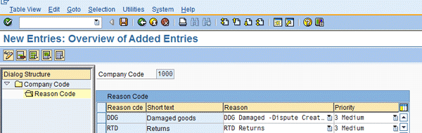 Click the New Entries button and map FI-AR reason codes with SAP Collections and Dispute Management reason codes (Figure 11). In this example, you have two reason codes, DDG and RTD, with the default priority of the dispute case as Medium.