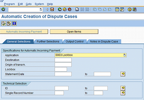 Now you need to learn the important selection fields that are required to create dispute cases automatically for the lockbox payments it processed earlier. There are two options: Automatic Incoming Payment or Open Items (Figure 20). Select Automatic Incoming Payment and enter the specifications for an automatic incoming payment. For the Application field, you have four options (Figure 21).