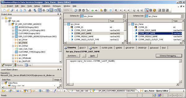 Consider the example of a combined push-down operation to the database. The data flow has two query transforms. The qry_Driver transform is the driver stage that contains the where clause that covers the delta range and only returns the changed records from the source (Figure 3). The qry_Parse query transform contains an Upper Data Services function to convert the last name field to upper case (Figure 4). In this example, the source database is SQL Server with an equivalent Upper function to convert the case of the field. SAP BusinessObjects Data Services combines both transforms operations into the SQL statement that it pushes down to the source database. Figure 5 shows the SQL statement that is pushed down to the SQL Server database from the data flow.