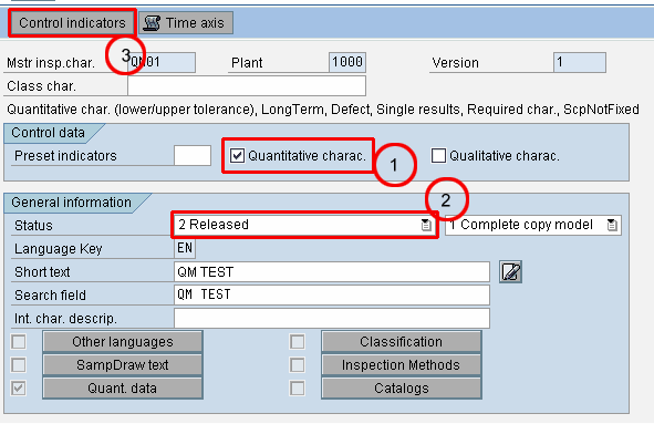 After defining the MIC, click the Master inspection characteristic button, which brings up Figure 11. Here, I defined the MIC to be quantitative (1) and gave its short text the status of Released (2). I then clicked the Control Indicators button (3), which leads to the Edit Characteristic Control Indicators screen (Figure 12).