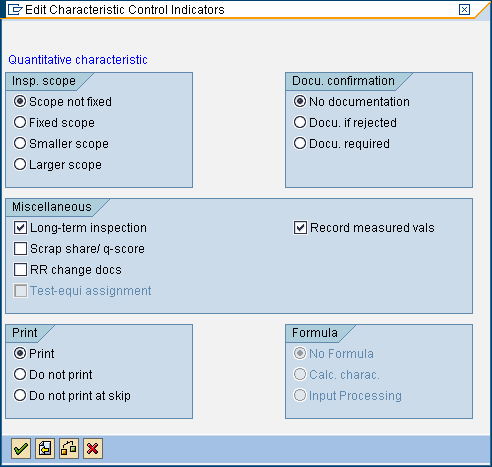 Click the continue icon to access further control indicators (Figure 13). Here I’ve defined that the MIC QM01 does not have a fixed scope, which means you can still change its details later if necessary. I’ve also selected Long-term inspection, which means that in case the results recording of this specific MIC is delayed, the usage decision can still be undertaken. I’ve also chosen the option to print the MIC in an inspection report.