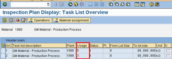 A usage specifies the purpose for using a specific inspection plan. A material can have different inspection plans for different usages – for example, for goods receipt-specific usage or for a universal usage. A universal usage can be for all the different inspections or for a goods issuance usage that is used in a sales order-related quality check before goods are sent to the customer against a sales order.