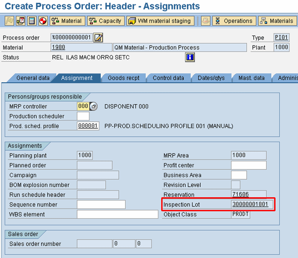 . As soon as the process order is released, an automatically created inspection lot for in-process inspection is generated, as shown in the assignment tab of Figure 24.