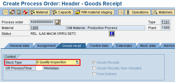 Once the goods are produced against a process order, you can perform the goods receipt. On goods receipt, an automatic inspection lot is created for which the standard QM processes of results recording, usage decision, and stock posting can be performed.
