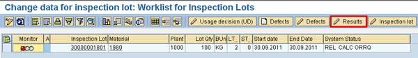 Enter the results and save them by pressing Ctrl+S or by clicking the save icon. This leads to Figure 35. Here select the inspection lot for which the results recording has already been performed (with system status updated to RREC) and click the Usage decision (UD) button.