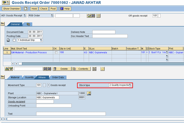 Follow menu path Logistics > Materials Management > Inventory Management > Goods Movement > Goods Movement or use transaction code MIGO (Figure 31). Enter the process order number and press Enter. In my example, the process order number is 70001062. Notice that on the goods receipt posting, the stock is posted in Quality Inspection and a separate and independent inspection lot is created. Save the goods receipt posting by pressing Ctrl+S or by clicking the save icon.