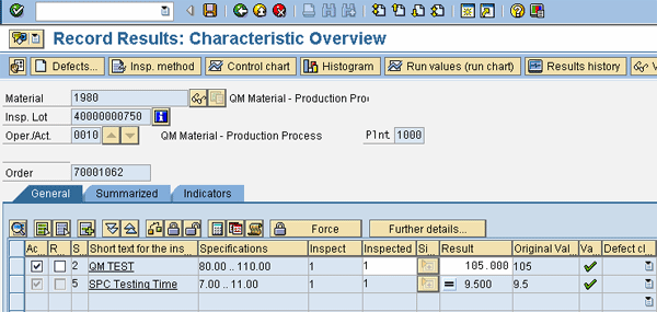 Select the inspection lot and click the Results button. This takes you to the results recording screen, in which the individual specifications of a material and its corresponding MICs are available for reference (Figure 28).