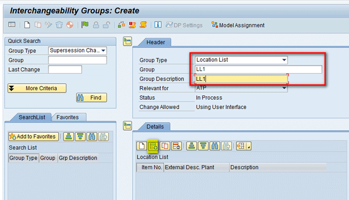 Locations are grouped together in a location list and are used to combine a set of locations. To create an interchangeability master data location list, execute transaction /INCMD/UI. In the screen that appears, click the create icon highlighted in Figure 7.